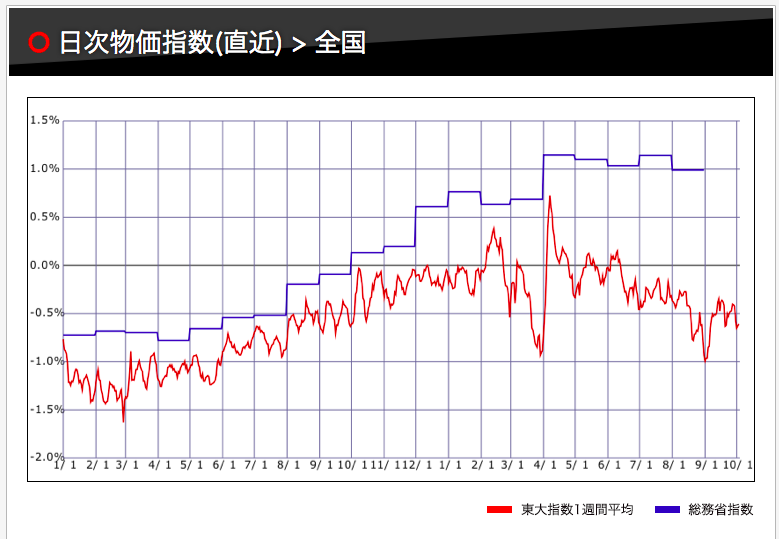 しかし、東大日次物価指数で見るとまた異なる風景が見えてきます。東大日次物価指数はスーパーの日用品や食料品のPOSデータから統計をとっているので、比較はできないとしても最新のトレンドを見ることはできます。その東大日次物価指数では、消費税増税後の6月後半あたりからマイナスに転じ、直近ではマイナス0.5%前後を推移しはじめてきているのです。しかも、価格があがっている品目を見ると、卵や牛乳、乳製品などの畜産品が目立ちますが、こちらは輸入飼料の値上がりによるものでしょう。
