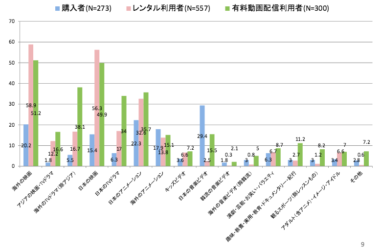 実際、一般社団法人日本映像ソフト協会が消費者を対象に行った、ビデオソフトの視聴ジャンルの調査でも、洋画と邦画が拮抗しており、また日本のアニメ、海外のドラマ、日本のドラマはいずれも欠かせません。