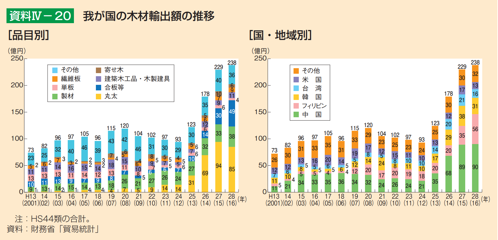 もちろん木材自給率も改善されたばかりか、なんと輸出も伸びてきているのです。中国の木材需要の増加、韓国におけるヒノキに対する人気の高まり、円安への推移などの影響とか。平成25年以降増加しており、平成28(2016)年の木材輸出額は、前年比4%増の238億円を記録しています。