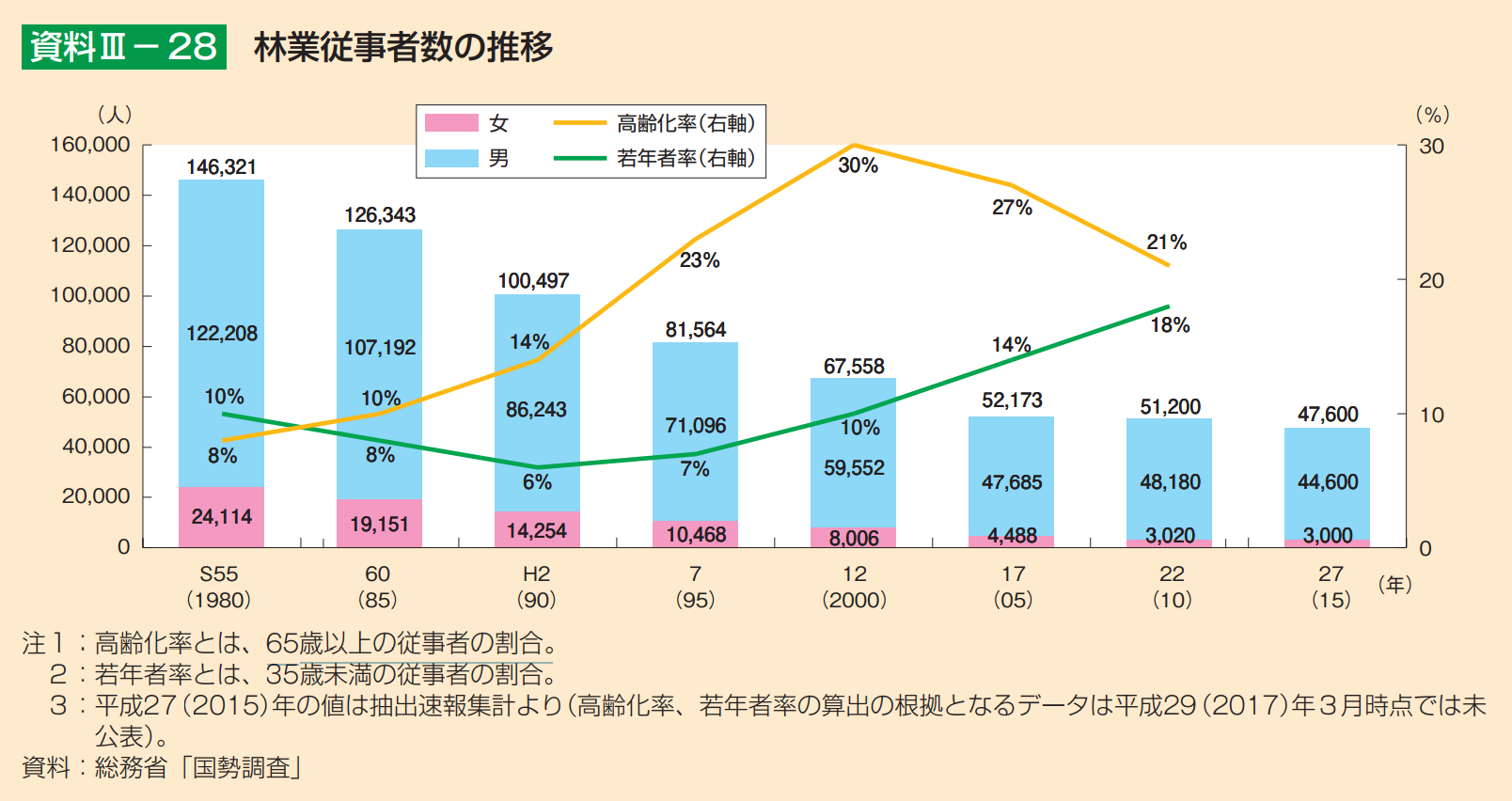 驚きです。生産量も平成14年に底を打ち、以降はむしろ伸びてきています。しかも林業と言うと高齢化のイメージがあったのですがそれも違っていました。林業従事者は減ってきたとはいえ、実際には、65歳以上の従業者比率は、平成12年の30%をピークに平成22年には21%に減少し、逆に35歳未満の従事者比率は、平成2年の6%を底に伸び、平成22年ではなんと18%となっています。