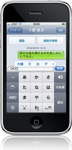 気になっていた日本語の入力方式ですが、テンキー方式というのでしょうか、携帯一般の入力方式となっていて、ちょっとダサイかなとは思いますが、そこは日本の習慣にならったということでしょうか。キーボード方式と選択できるようになっていればと思いましたが、まあ些細なことです。しばらくはiPhone3Gが携帯の話題をかっさらうでしょうから、他のキャリアは大変ですね。
