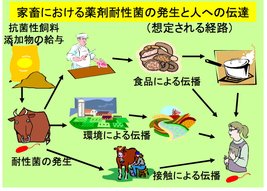 抗生物質を使うのは、病気の予防ではなく、あくまで成長促進のためで、それを多用することによって耐性菌が発生したり、増加し、食品そのものからだけでなく、家畜との接触からなどさまざまな経路で人に感染拡大するほうが危ないということです。農林水産省消費・安全局によるレポートもありますのでご関心のある方は、ぜひ御覧ください。