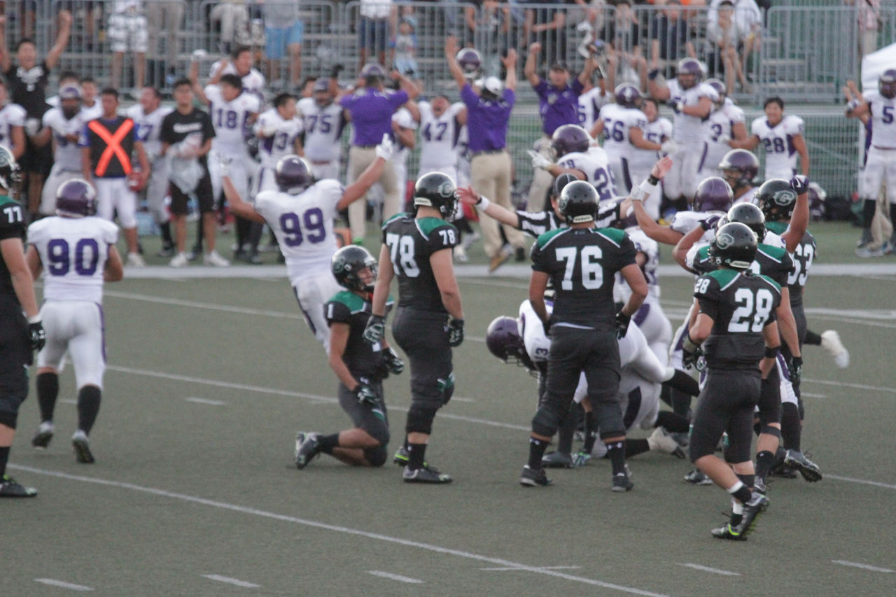 しかし、そこに反則を示すイエローフラッグ。パスを投げ終えたQBに対する危険なタックルでした。そこから壮絶なドラマが始まります。京大の反則も重なったとはいえ、龍谷大学の怒涛の反撃で、京大ゴール前30ヤード、残り17秒。もうこれで攻撃権がなくなる最後に、同点のフィールドゴールではなく、ギャンブルにでたパスが成功、ゴールも決まって28対24の大逆転でゲームを制しました。写真は大逆転に喜ぶ龍谷大と対照的な京大の選手たちです。