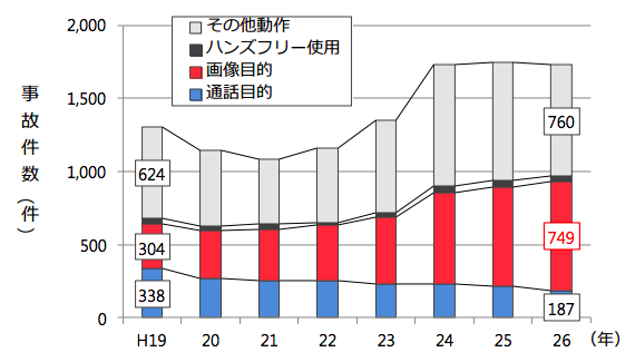 事故件数では年間1,500件を超える水準で推移しています。よく自転車でのながら運転による事故も指摘されていますが、実際にはその98.3%が自動車によるものだそうです。
