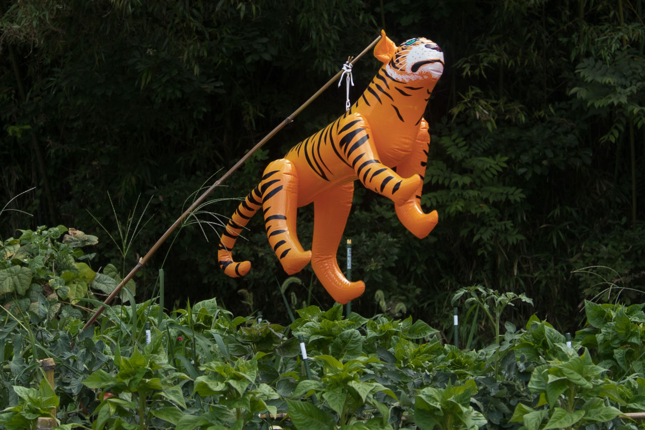 ところが今日、さらに新しい鳥獣被害滞策グッズなのか、兵庫県小野市の道路脇の畑で「エアモンスタータイガー」を見たのです。次ページの写真をどうぞ。